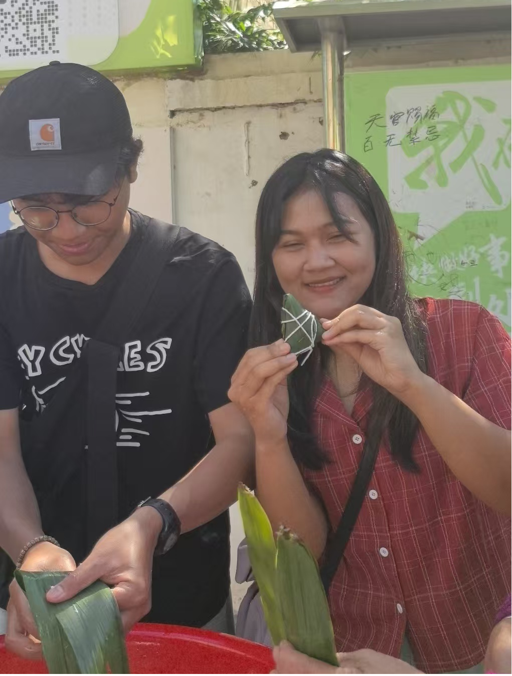活动现场,社区工作人员提前备齐糯米、红枣、粽叶等包粽子所需材料。面对折叠粽叶、填充馅料、捆扎成型等工序,留学生们起初显得手足无措。社区居民全程耐心示范,细致讲解卷叶成漏斗状、控制馅料比例、缠绕棉线等关键技巧。留学生们专注模仿、反复尝试,虽包出的粽子形态多样,但始终热情高涨。