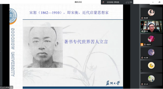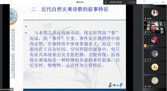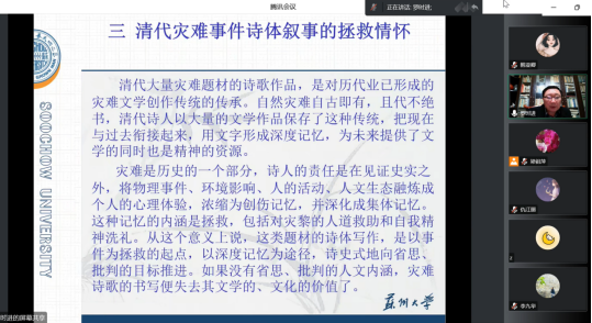 随后,罗老师对清代灾难事件诗体叙事的拯救情怀进行深入细致地讲解,图文结合,层层递进。罗老师总结道,在灾难面前,诗人需要行动的拯救,同时需要以仁厚的道德情感凝聚社会意志和力量,这是近代诗人灾难诗歌书写的价值所在。罗老师结合现实与自己的治学经历,指出表达民瘼、思考生命价值也是诗人、学者的责任所在,并引用晚清宋恕“著书专代世界苦人立言”之句强调学术研究也应当关注现实问题。