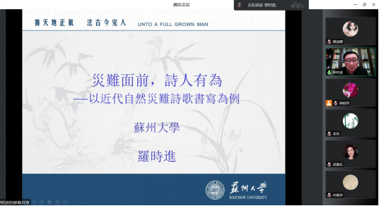 举办了题为“灾难面前,诗人有为——以近代自然灾难诗歌书写为例”的学术讲座,讲座采用线上的形式展开。本次讲座特邀苏州大学特聘教授、博士生导师罗时进老师主讲,讲座由海角社区