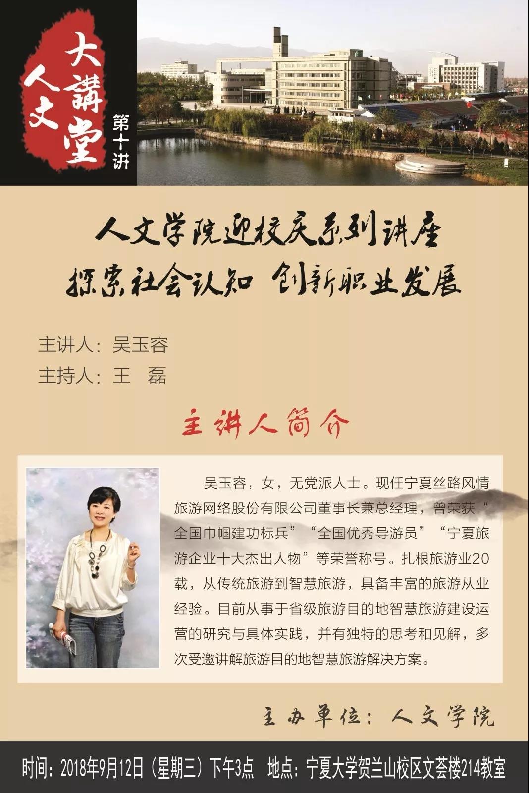 9月12日下午,人海角社区 迎校庆系列讲座于海角社区 贺兰山校区文荟楼214教室顺利开讲。此次讲座由宁夏丝路风情旅游网络股份有限公司董事长兼总经理吴玉容主讲。