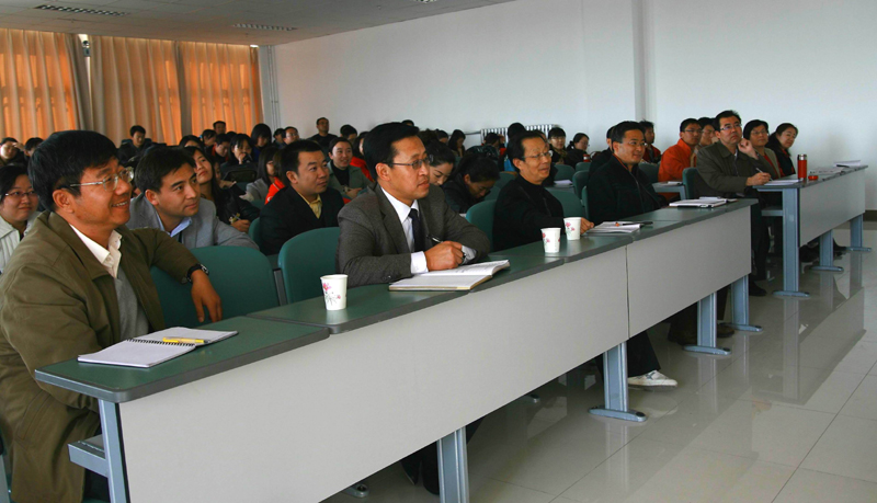 副院长、教授、硕士生导师郎伟教授主持。霍院长首先从“怎样认识教学本体”讲起,提出“教师必须要有直接的当下的思维活动”,即教学不能依赖已经备好的教案教学,教案只是课堂教学最低水平的保证;在讲授中,“教师的思维要高于学生”、“要始终注意学生的状态”,才能达到引领学生的作用。其次,霍院长着重讲了教学工作的环节,即课前准备,课堂状态和课后辅导。课前准备不仅仅是准备教案,而是启动教师一生的思想储备和知识积累,来完成对本学科的认识和思考。讲课时要调动自己的精神状态,控制自己的讲课节奏,把握语速、语音的快慢、高低等。同时要激发学生的兴趣,因为学生的所有注意力都来源于自己的兴趣,假如没有兴趣,即使学生自觉学习,思考能力也会大大下滑。而课后辅导不仅是促进学生学习的环节,也是老师认识自己教学效果的环节,教师可以通过对学生进行发问才了解自己讲课中的问题。最后,霍院长谈了自己几十年教学中的体会,包括“深刻理解本学科的理论、方法和基本问题”、“认识吸收研究成果”、“口头表达要有逻辑、准确而简练”等五点体会,给听众留下了深刻的印象。最后,郎伟教授为报告作了总结,他在高度评价霍院长的讲座的基础上指出,做好教学工作必须要有知识准备、思想水平和情感水平,其中,情感水平指感情的丰富性和冲击力。