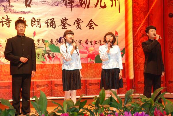 此次鉴赏会分“源远流长” 、“繁华盛世” 、“少年中国”三个篇章,主持人谈吐自如流畅,举止大方文雅,使整个比赛有条不紊、顺畅自如;开场的古筝合奏大气恢弘,使决赛充满激情。在个人组赛事中, 《将进酒》的朗诵者2010级新闻班王杨豪情满怀、自信十足,充分表现出了诗歌的意境;而2010级汉语言班的李学精同学更将《大堰河,我的保姆》演绎的感人肺腑、催人泪下。在团体赛事中,徐文博、宋丹、马丹三人朗诵的《繁星春水》充满了人世间的爱与大自然的美;侯博文、王文砚、杨锐、杨娇组合朗诵的《少年中国说》激情澎湃、振奋人心,激发了在场所有人的爱国热情。决赛中间的歌舞表演与书画表演使比赛更加丰富多彩。最后,来自2010级汉语言班的李学精同学荣获个人比赛第一名,由王文砚等组合朗诵的《少年中国说》荣获团体赛第一名。本次鉴赏会历时两个半小时,为寒冬周末的海角社区