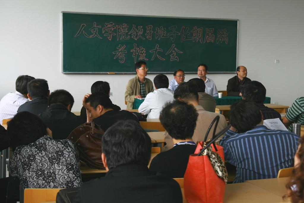 领导班子任期届满考核暨教职工大会在A区文科楼406教室召开。校领导李伟副校长,校第二考核组组长、校纪检委杜国华副书记及其成员,人海角社区