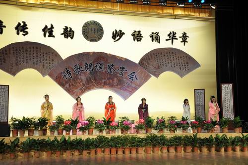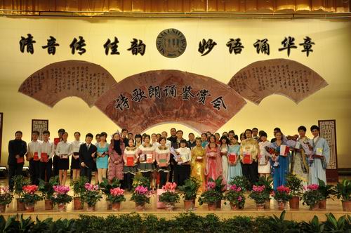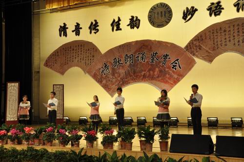 的35名本科生和研究生,声情并茂地为大家奉献了一场绚烂多彩的诗歌盛宴。在《关雎》、《水调歌头》、《钗头凤》、《红楼梦曲》等一曲曲古典诗词的吟诵中,现场同学领略了中国古代诗人的温婉与洒脱、豪情与离愁;而《毁灭》、《雨巷》、《川江号子》、《吟青春之歌》等现当代诗歌则从不同的角度展现了中国诗歌文化的魅力和中国诗人追求正义、执着奋斗的可贵精神。由2011级旅游管理班杨栋同学激情朗诵的《少年中国说》赢得了同学们热烈的掌声,将比赛现场的气氛推向了高潮,并最终凭借着出色的发挥和表现获得本次诗歌鉴赏会个人组一等奖,来自2012级的马芳等六位同学以诗歌《我的祖国》获得团体组一等奖。