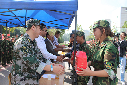 最后,学院领导向教官及2013级新生赠送了中秋佳节的慰问品,给教官和新生们送去了节日的温暖。相信教官和同学们定会感受到学院领导对他们的重视与关怀,并将以更加昂扬的斗志参加后续的训练,确保圆满完成军训任务。