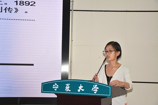 之后,大会进入论文报告环节。报告由2015级文字学专业王婵宇主持。在本届学术论文大赛中得奖的孙爽、张知非、韩中慧、崔幼玲、田珺、刘贺等6位同学依次上台作了题为《不被承认的吃醋——<海上花列传>中投射于两性关系的转型期心态》等的论文报告,丁峰山、钟亚军、胡玉冰、霍维洮、杨文笔、蔡永贵等指导老师对其学生论文进行了专业点评。其中,胡玉冰教授谈到韩中慧同学能从上课的讨论入手,提出较为新颖的观点,认真研究、刻苦探索的学习态度值得广大研究生学习。霍维洮教授在点评中指出历史研究本质上是社会研究,要始终依赖文献,肯定了崔幼玲同学立足于文献的研究方式。
