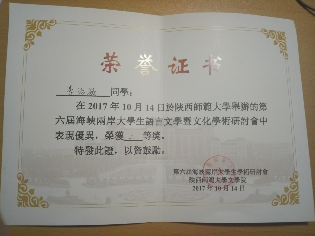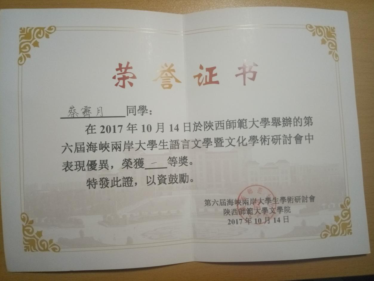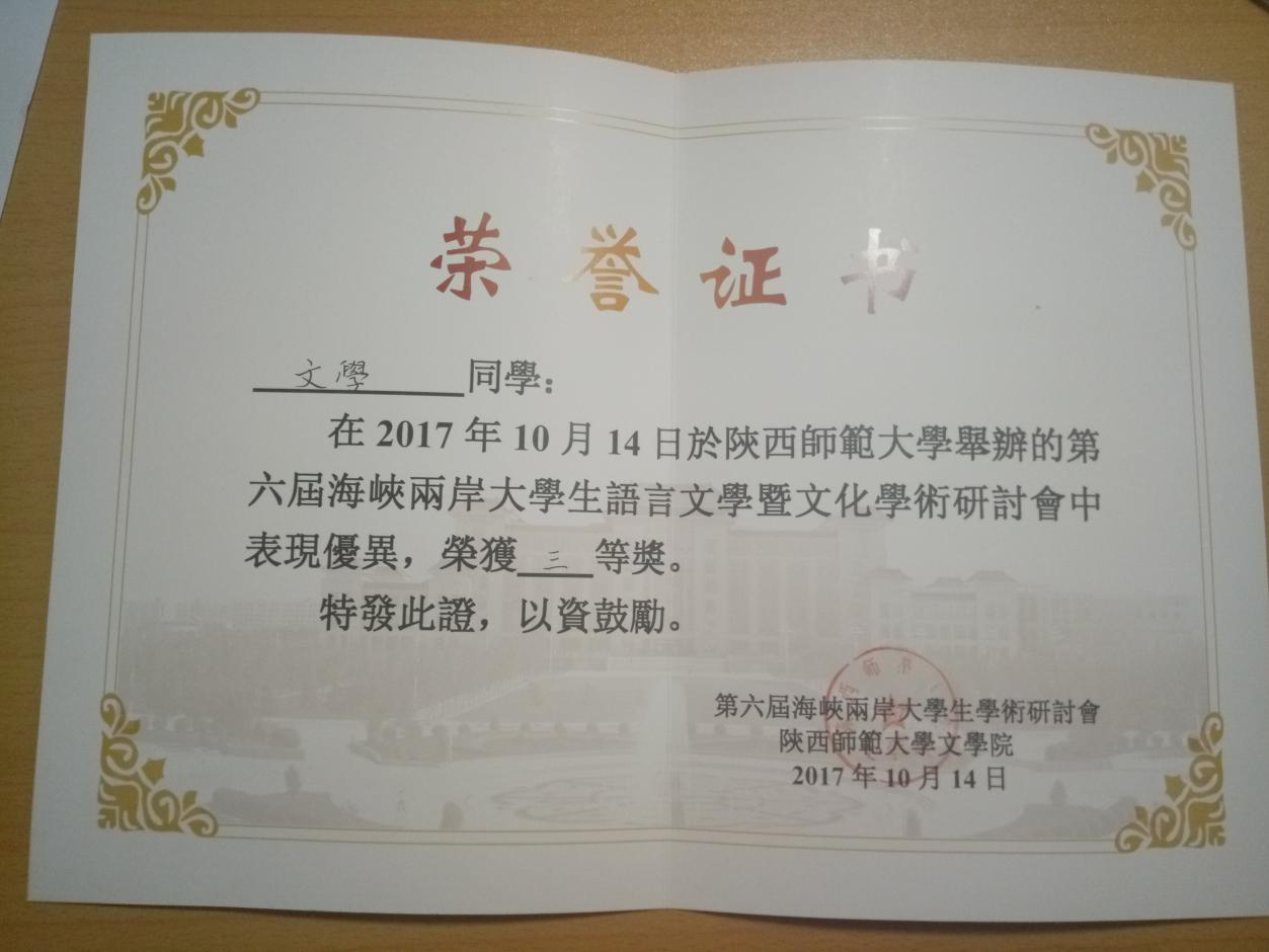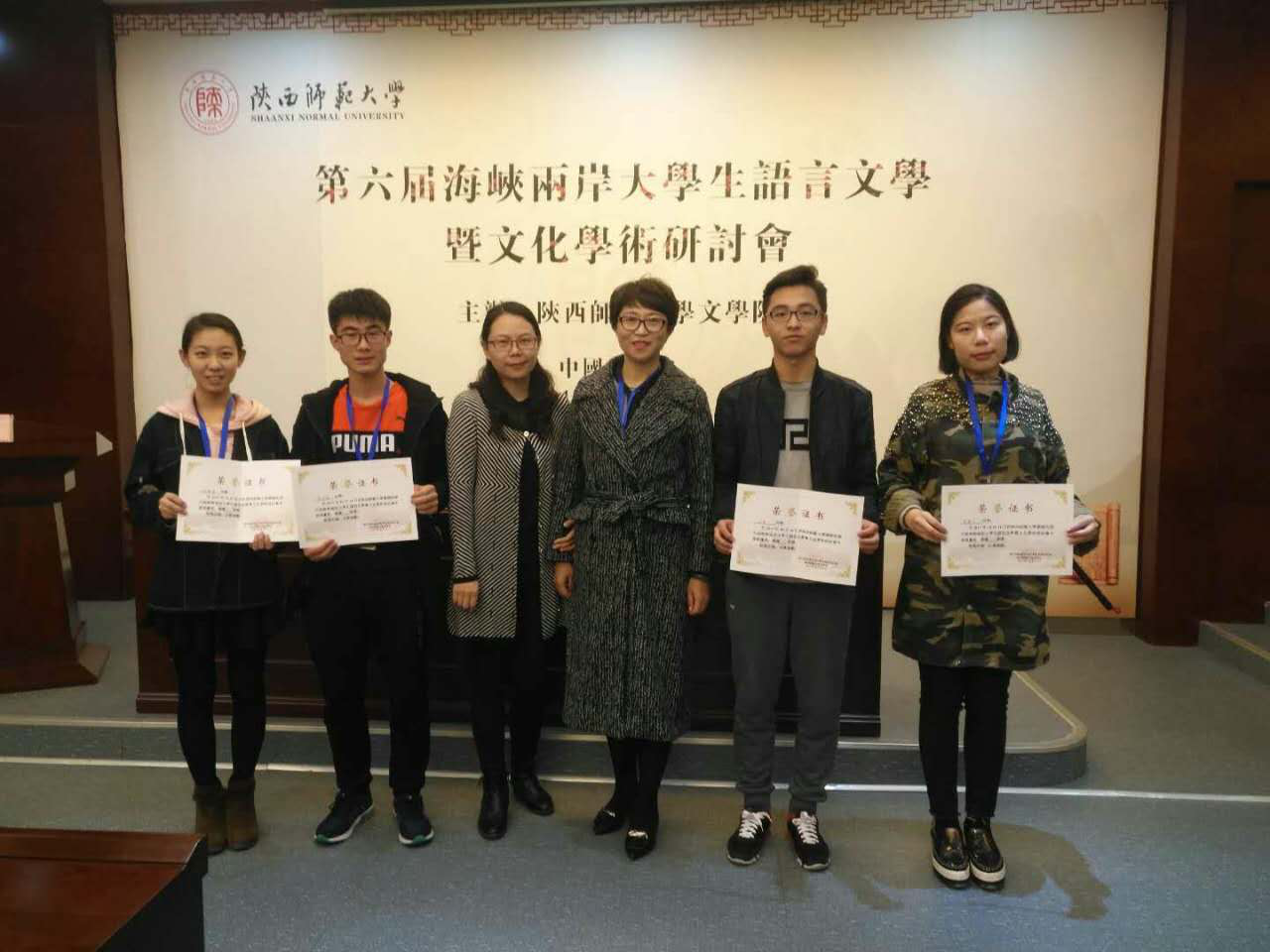 2014级汉语言文学(教育)专业的蔡霁月、张赟洁及2016级汉语言文学(文秘)专业的文学、李治发等四位同学,在副院长刘鸿雁、中文系副教授杨学娟的带领下,应邀赴陕西师范大学参加“第六届海峡两岸大学生语言文学暨文化学术研讨会”,这是中文系本科生首次参加海峡两岸大学生的学术交流会。来自台湾、安徽、江苏、吉林、山东、陕西、宁夏等地八所高校的29位本科生在研讨会上汇报、交流了自己的论文,经过评议老师的点评、专家评比、匿名投票,海角社区