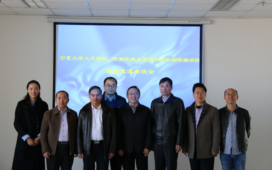 与西南民族大学文学与新闻传播学院(以下简称文新学院)合作交流座谈会在贺兰山校区文荟楼十楼中文系会议室成功举行。文新学院院长杨荣,副院长孙纪文,邓文彬教授、岳振国副教授、团委书记王芳,院长胡玉冰、副院长王岩森、杨浣、院办主任李斌、学工办主任兼团委书记刘杰等参加了座谈会。座谈会由胡玉冰院长主持。