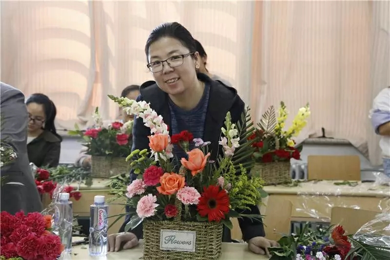 戚建筠首先介绍了中国传统插花讲究自然美、线条美甚至是想象的意境美,茶席插花讲究素雅、小巧、精细,其中蕴含着清雅的禅意。她说插花不仅是一门设计的艺术,在追求高超技艺的同时,也应注重插花过程中的礼仪,例如在插花过程中需注意保持桌面整洁,花篮干净,插花完成后应不留垃圾,营造艺术的美感氛围。其次,她通过康乃馨、勿忘我、玫瑰等花向大家阐明如何修剪花枝,整理花材,她强调修剪枝条应达到由人做、宛自天开的境界。花与容器的结合,虽注重整体美,但也应有花的尊严和状态,彼此适当的协调才是最完美的。最后,她让大家自由发挥,随意想象,随心而走。大家可从颜色、结构、造型等方面构造出自己心目中的花型,从高度、宽度与厚度方面考虑如何着手。同时,插花需要思考主花、副花和补花的适当搭配与巧妙结合。在插花的过程中,大家热情高涨,积极与戚建筠谈论插花知识及技巧。