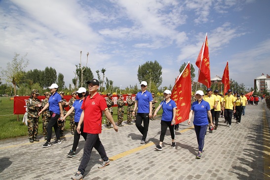 军训团精神饱满,气势昂扬的学生,他们正等待着老师们的到来。十分钟后,教职工们排着整齐的队伍,举着飘扬的红色旗帜,从南面先经过教育学院军训团,在步入人海角社区
