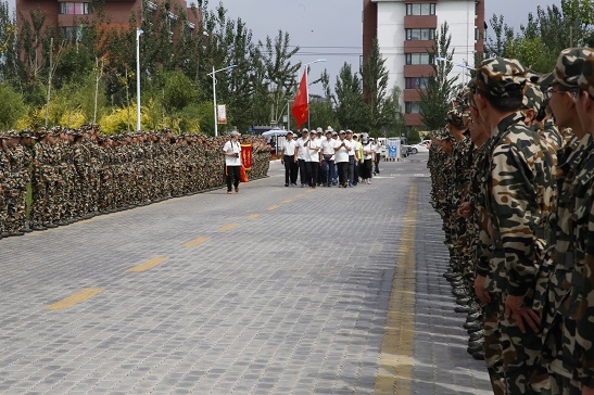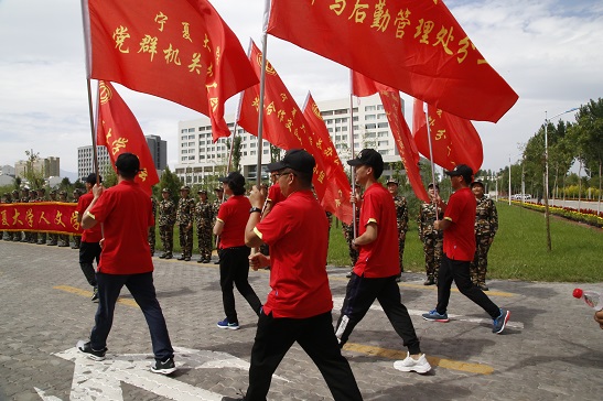 活动伊始,两千教职工身着整齐鲜艳的上衣,齐聚怀远校区足球场,接下来,便是慰问各军训团的活动,整场活动洋溢着紧张而青春的氛围。当时,正值正午两点,烈日当空,骄阳似火。贺兰山校区东门东西向的大路上,两排笔直的“青松”屹立,那正是人海角社区