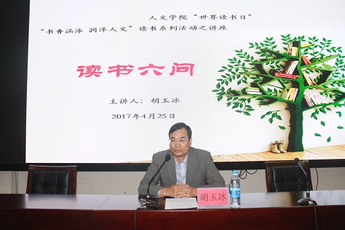 其次,胡玉冰院长作了“读书六问”的讲座。胡院长结合自身求学和读书的经历与同学们分享了他的读书经验。他就“读书六问”即“书” 是什么、读书何用、应读何书、如何读书、书以何本为善、何不读书为大家一一做了阐释。关于“读书何用”,他从2016年语文高考作文题切入,联系古人有关读书意义的著作为大家进行了详细生动地讲解。围绕“应读何书”,他给同学们推荐了一组包含教科书、原典、学术类著作和方法论类著作以及工具书四种类别的应读书目供大家作阅读参考。同时他也为大家讲授了自己的读书方法和学习方法。他告诉同学们读书要三思而后读,多读有用的书;读书还要有侧重点,做到不同专业读不同种类的书。他就“如何读书”为大家介绍了古今中外名人的读书方法,告诫大家专业的读书要系统且有计划,博观而约取,厚积而薄发;对于经典著作要精读、细读、反复读。而非专业的读书则做到博览群书、快读、泛读即可。同时他还建议大家保留自己读过的教科书。另外,他为大家通报了我校、武汉大学和上海交通大学人文专业学生的图书借阅量以激励大家积极读书。他还从“讲求版本,首选善本”和“不朽的纸质本”这两个方面解答了“书以何本为善”这一困惑大家的问题。在讲到“何不读书 ”时,他说到,读书能改变人的生活习惯和方式,能教大家如何做人,让大家变的睿智、充实、自信。他还说读书贵在坚持和自觉,由此希望大家能够有意识的培养自觉读书的习惯。