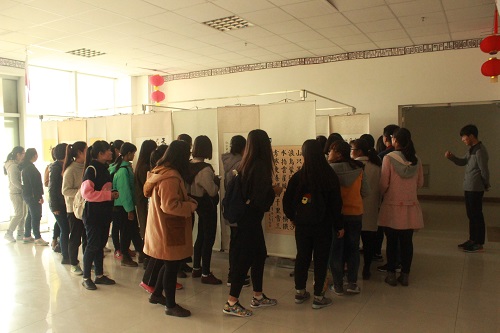 开幕式结束后,进入作品欣赏环节及互动环节。各班组织同学有序参观欣赏作品,并在文科楼406教室与“可为书画社”的老教师们进行交流,学习书法艺术,接受书法艺术的濡染熏陶。